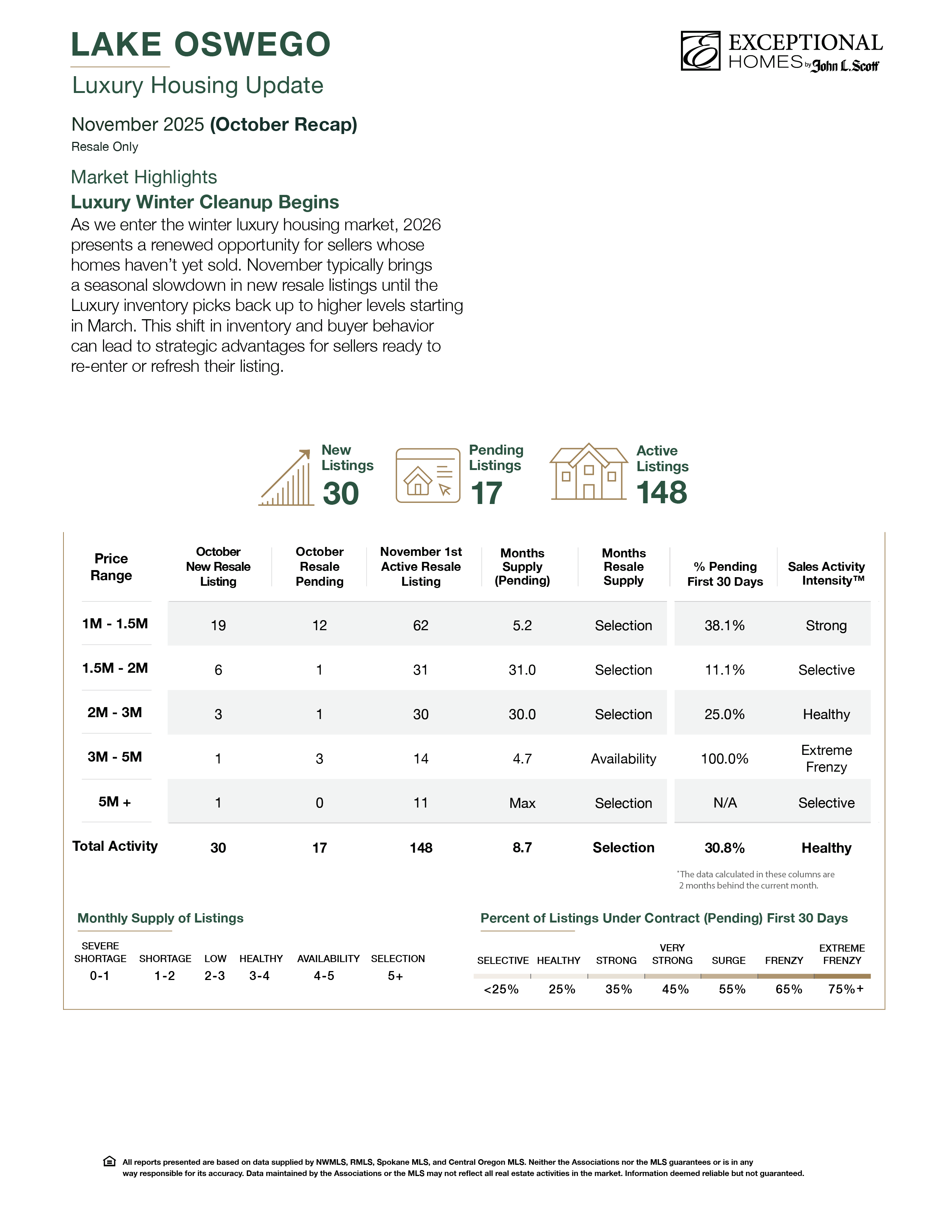 November typically brings a seasonal slowdown in new resale listings until the Luxury inventory picks back up to higher levels starting in March. This shift in inventory and buyer behavior can lead to strategic advantages for sellers ready to re-enter or refresh their listing.